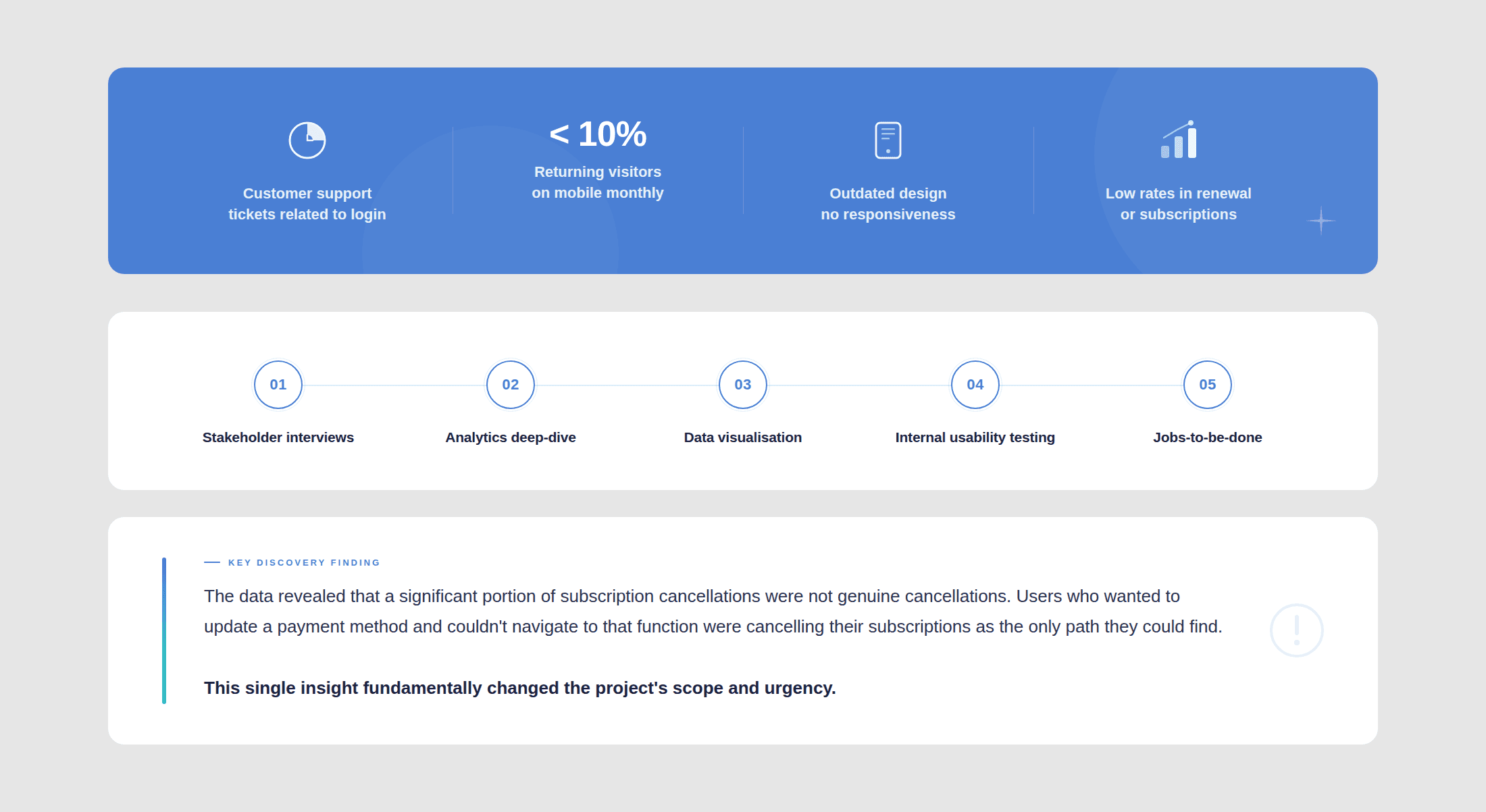 The project was aimed at a visual refresh when I joined it. I slowed that momentum for a while, as it was clear that we needed to uncover the underlying issues and discovery came first. I led a data-driven discovery phase to uncover why users were abandoning the platform. We moved through quantitative data, qualitative interviews, user testing and internal testing to map the pain points.